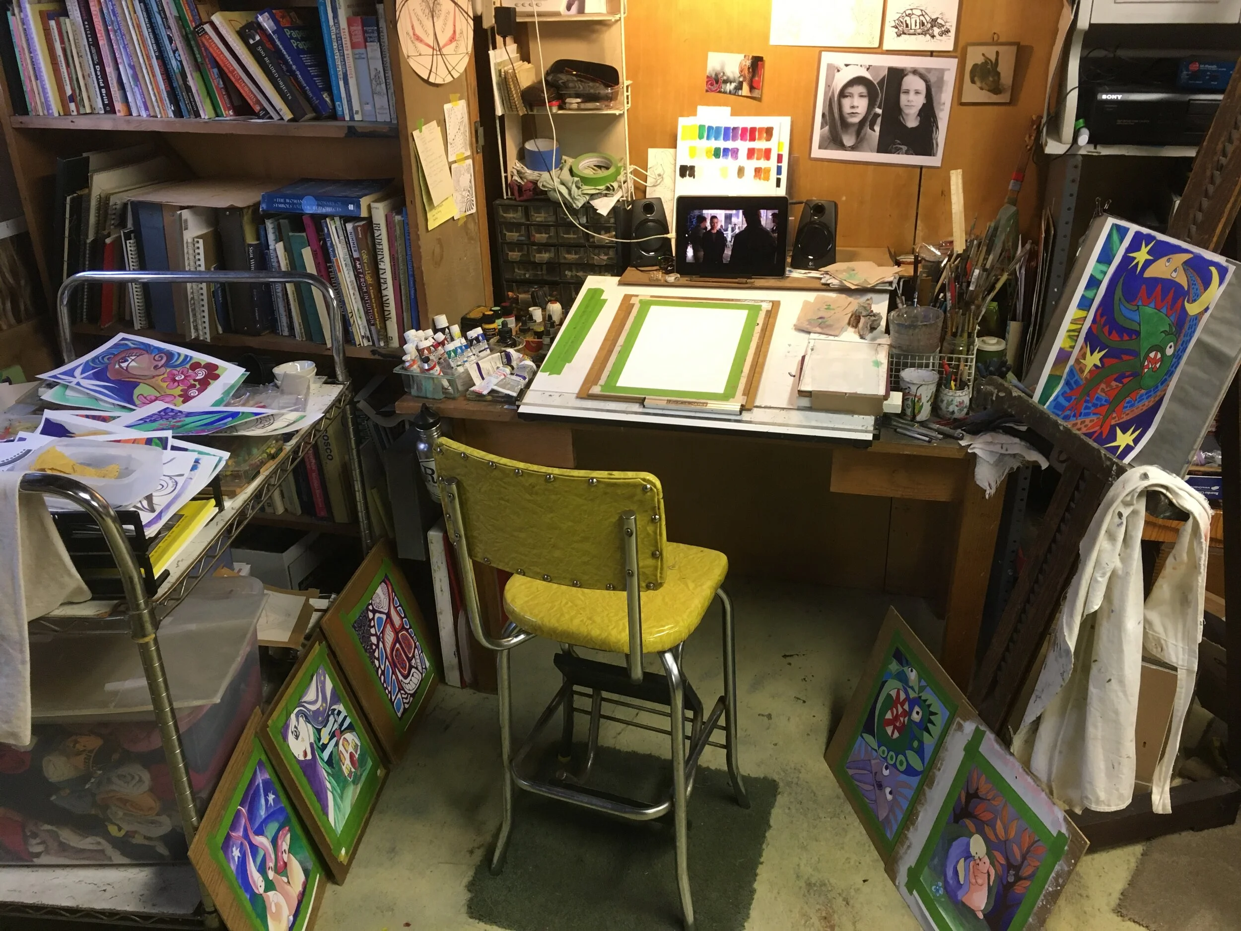 I approach the blank paper with no preconceived notions. My work-table has materials out and ready; I choose media and colors intuitively, without leaving room for my critical, rational, logical mind to interfere.